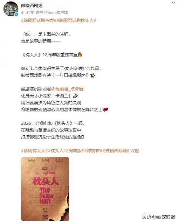 12月4日,鼓楼西剧场官方账号重磅官宣:越剧演员陈丽君将领衔主演话剧《枕头人》12周年版,化身天才小说家“卡图兰”,这是陈丽君的话剧首秀,也是首位女版卡图兰。