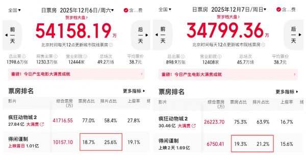 据猫眼数据显示,《得闲谨制》上映首周末出现排片率高于票房贡献率的“倒挂”情况:周六排片占比为25.6%,票房占比为18.7%;周日排片占比为21.2%,票房占比为19.3%。具体来看,在12月6日中午时段,影片排片占比介于25.6%至38.7%之间,而累计票房约8400万元,票房占比为23.8%,低于排片占比,倒挂幅度约5%。