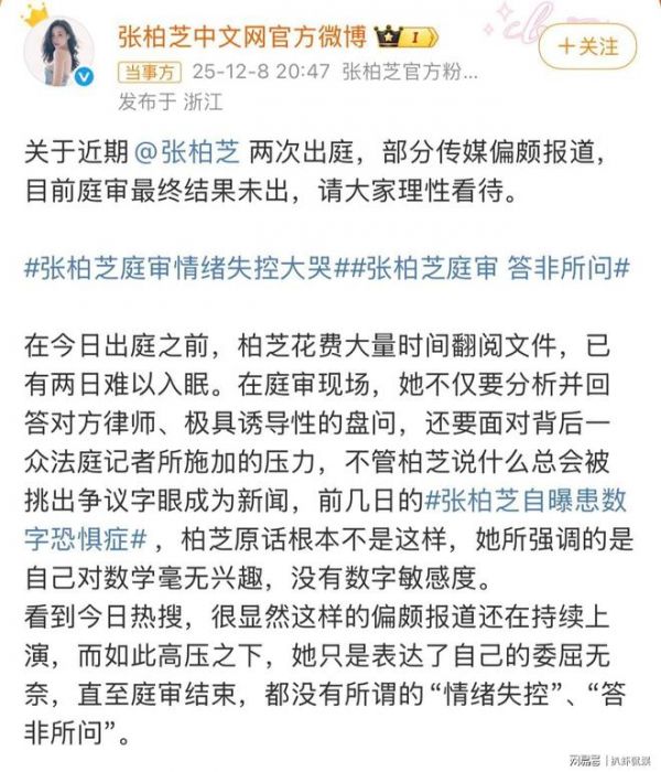 随着舆论不断发酵,网络中对于张柏芝不友好的声音层出不穷,8日晚间,张柏芝方也在社交平台中发声回应,否认张柏芝在庭审时情绪失控崩溃大哭,否认她答非所问。