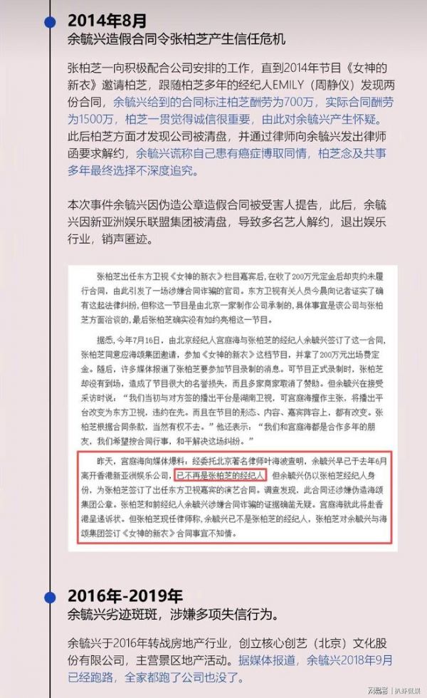 此外,张柏芝方还公开余毓兴造假合同的始末,这导致张柏芝对其产生信任危机,两人也从2014年8月之后,结束工作上的关系。