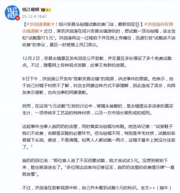时隔6天,洪剑涛于12月8日发布了道歉视频。他承认自己此前确实不了解乌毡帽的材质特性和易损性,对店主的方式“不够理解造成误会”,并向施奶奶和网友致歉。他也解释称当时未注意到收费标识,但强调“并非故意遮挡”,呼吁公众不要过度解读。
