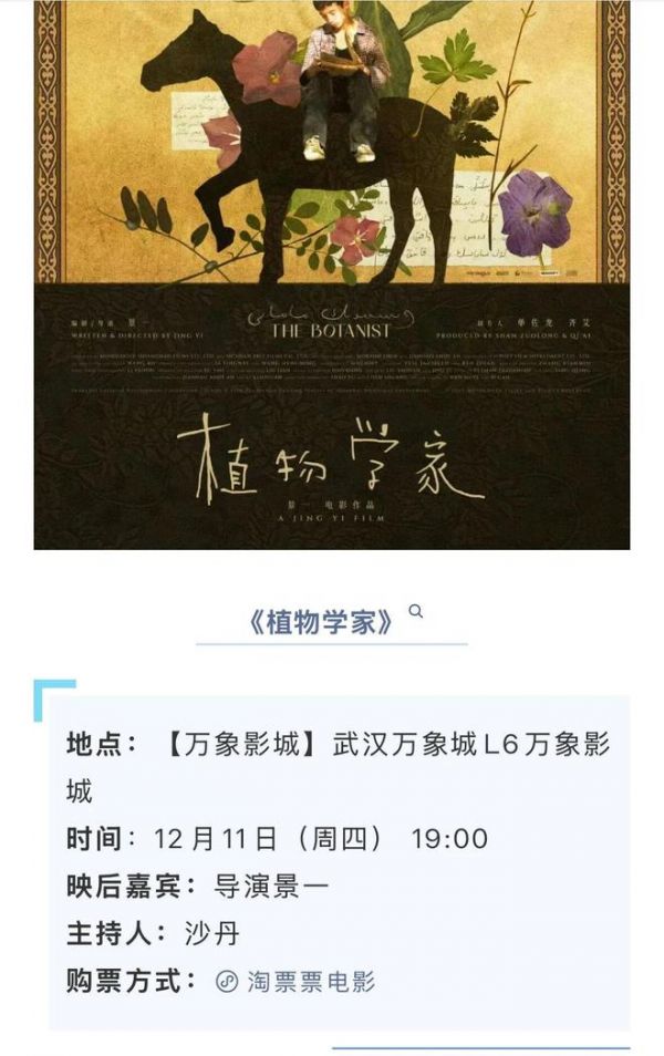 周四11号晚7点,我将在万象影城(万象城杜比影院点)主持景一导演的个人首作《植物学家》映后交流,影片采用4:3画幅构图,异常的优美,充满诗情画意和灵性,相继入围今年柏林、香港、北京等电影节并获奖,他是今年最受关注的新锐青年作者之一。