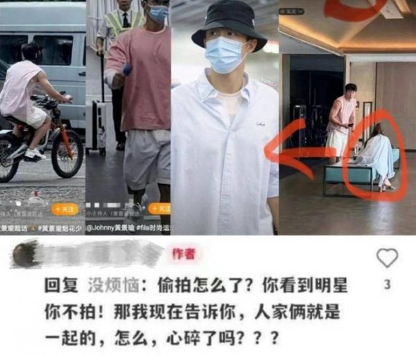 有黄景瑜的粉丝不满网友偷拍自家偶像,但拍摄者直接在评论区回怼,表示自己拍摄明星很正常,还表示人家两人在一起了,粉丝是不是心碎了等。