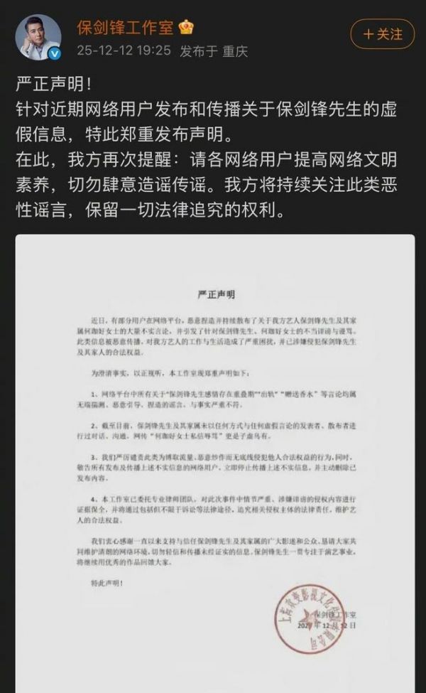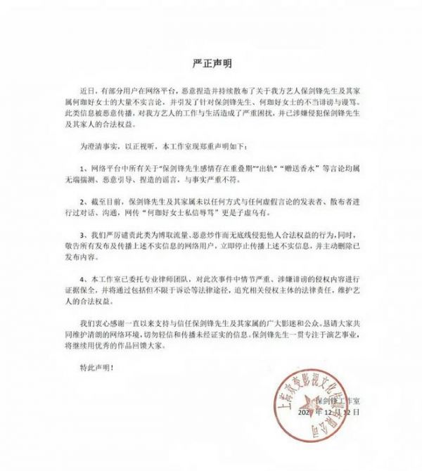 随着舆论不断升高,保剑锋方也在12月12日晚间发布声明,回应争议的同时也否认网络中的不实传言。