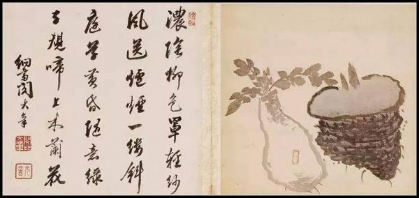 《种芹人曹霑画册》长31.5厘米、宽29.4厘米。全册共纳有设色写意画八幅,每幅画均在左侧附有题诗页。画页与诗页,粘连成帧,八帧粘连,折页成册。画册材质为绢,诗页材质为纸。我们一起来欣赏:
