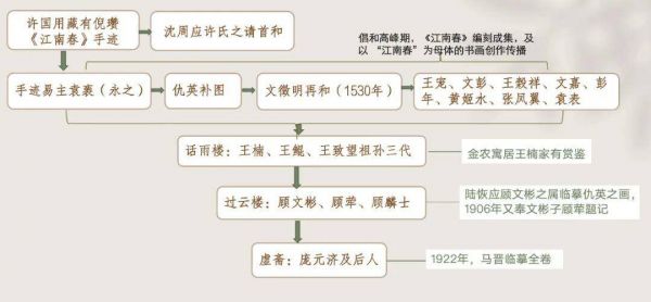 中国嘉德拍卖推文中,记录着仇英《江南春卷》 创作及收藏过程