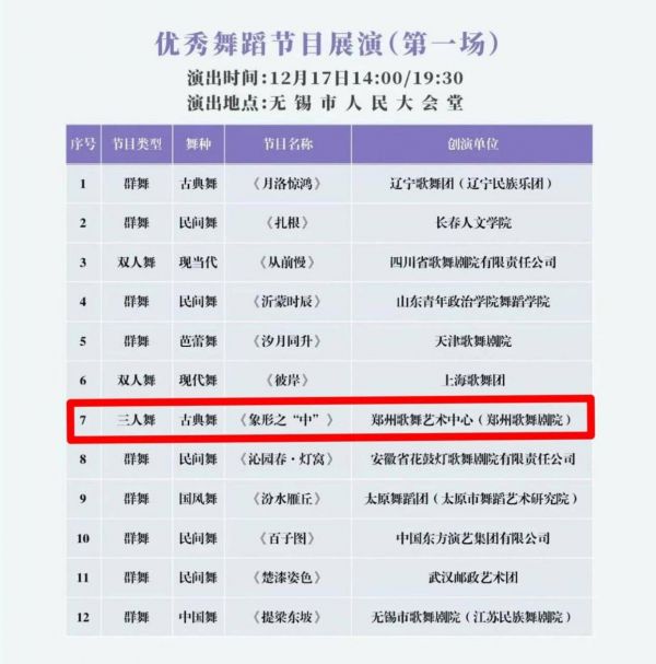 11月28日,中华人民共和国文化和旅游部正式公示第十五届全国舞蹈展演入选名单,郑州歌舞艺术中心(郑州歌舞剧院)创作演出的舞蹈作品《象形之“中”》从全国数百个优秀作品中脱颖而出,成功入围。12月17日,舞蹈《象形之“中”》正式亮相第十五届全国舞蹈展演活动。全国舞蹈展演是国家级艺术盛会,45年来推出了一大批优秀舞蹈作品,发现、培养了一大批创作、表演人才。