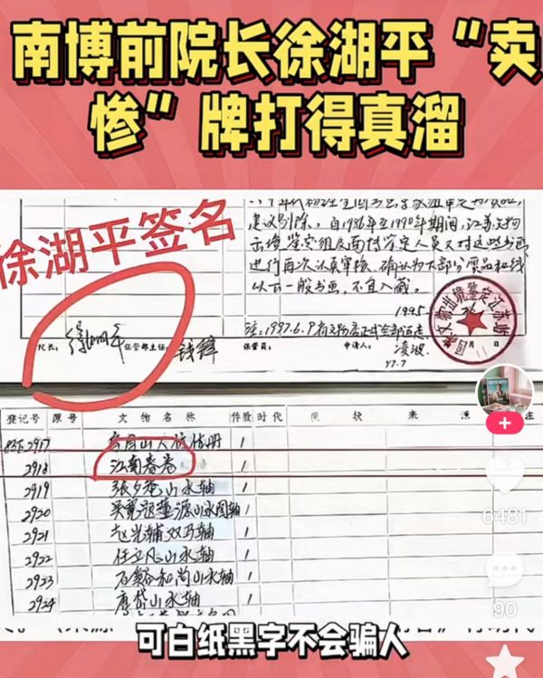 可网友的眼睛是雪亮的:1997年那张文物拨交单上,你的签名工工整整;当年你既是南博常务副院长,又是江苏省文物总店法人,左手倒右手处置国宝;现在6800元贱卖的画飙到8800万,你倒说“没经手”“不是鉴定家”?