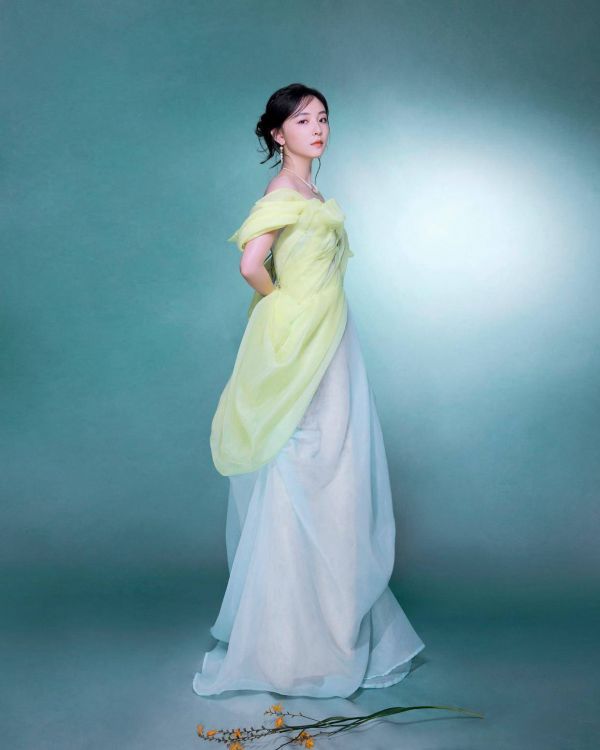 吴倩诗会风采,黄绿礼服勾勒曼妙,优雅气质令人倾心!