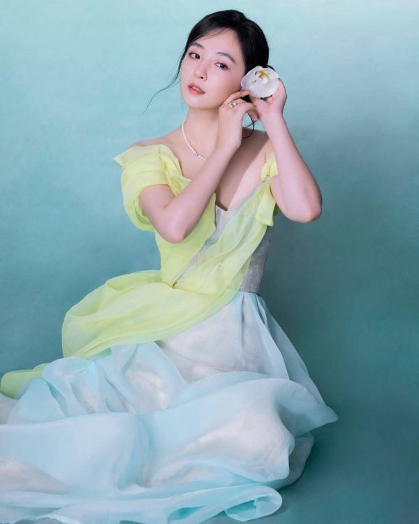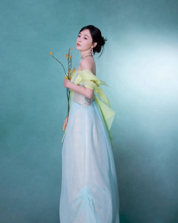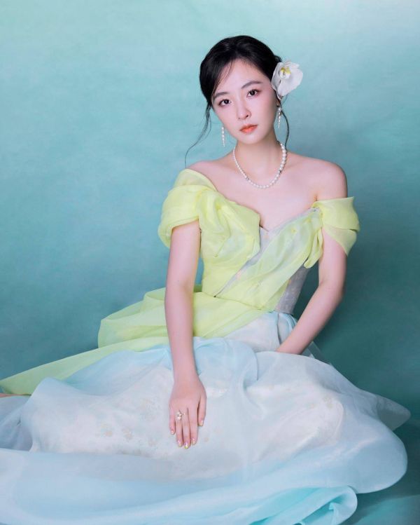 黄绿渐变的色彩,清新而柔和,给人一种温暖而又舒适的感觉。露肩的设计展现出她优美的肩部线条和精致的锁骨,增添了几分性感与妩媚。而裙摆的薄纱材质,轻盈灵动,随着她的步伐轻轻摇曳,仿佛是在诉说着一个浪漫的故事。
