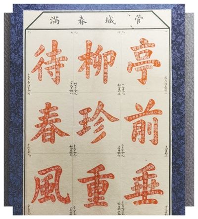 “写九”,是指“文字式消寒图”。这种消寒图需选择9个9画的汉字,组成一句有意味的句子,以空心字形式书写或印制于纸上。到了清代,从宫廷到坊间,这种形式都非常流行。其中,最著名的语句当数“亭前垂柳珍重待春風(风)”(见图,霍本科摄)。玩家每天按照笔画顺序填实一笔。当然,有的人还会在笔画旁记下当日的天气。这样,每填实一字,即过一个“九”,当九字写实,春回大地。除了前句,“春前庭柏風(风)送香盈室”等也是常用的语句。“写九”的过程,既可记录天气,也表达了盼春的心情。