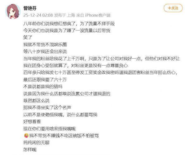 12月23日,曾艳芬在社交平台再发文怒斥丝芭:“当年我的粉丝给我花了上千万啊,只是为了让公司对我好一点,但他们对我不好让我在团身心受创就算了,对粉丝更是没有一点尊重良心”,“说是因为我什么话都敢说连累公司才逼我退的”,曾艳芬还表示“我就不带货不混娱乐圈,等八十岁我还会出来说。”