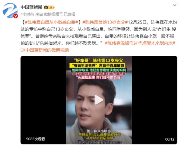 12月25日,陈伟霆在专访中首谈自己13岁丧父,从小敏感又自卑,怕遭到同学们的嘲笑,之前就被说“有妈生,没爸养”,敏感到甚至一度拒绝母亲独自来学校观看自己的演出。但陈伟霆有一股不服输的劲儿,“头越抬起来,你们越不欺负我。”(来源:中国蓝新闻)