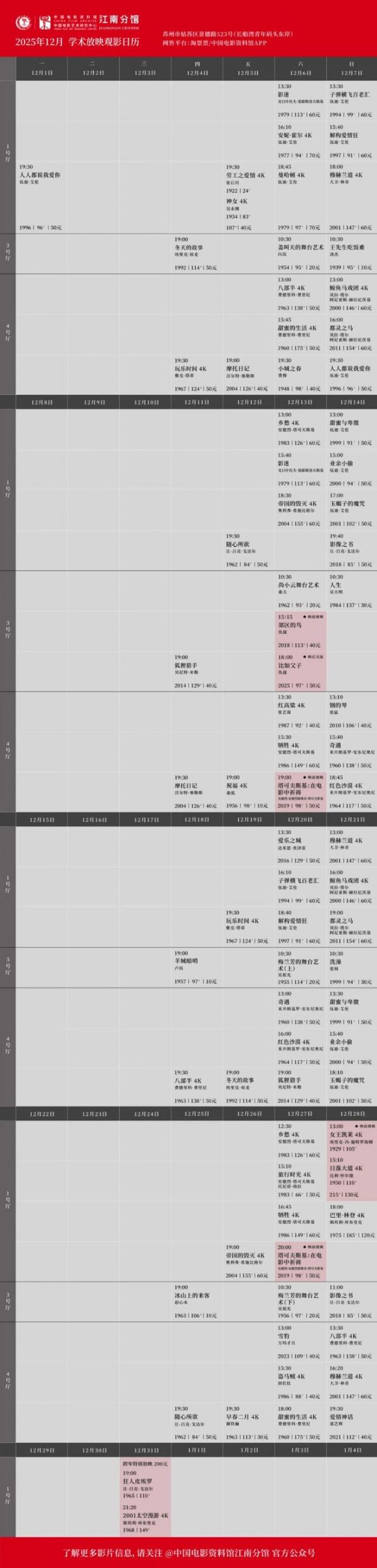 岁序更替,华章日新,2026年将至,江南分馆的1月放映昨日已开票。夏衍作品回顾、伍迪·艾伦作品精选、罗伯特·罗西里尼与埃里克·侯麦汇聚而成的大师回顾、丹麦影史经典等精彩专题一并呈现,共同开启新年的光影篇章。