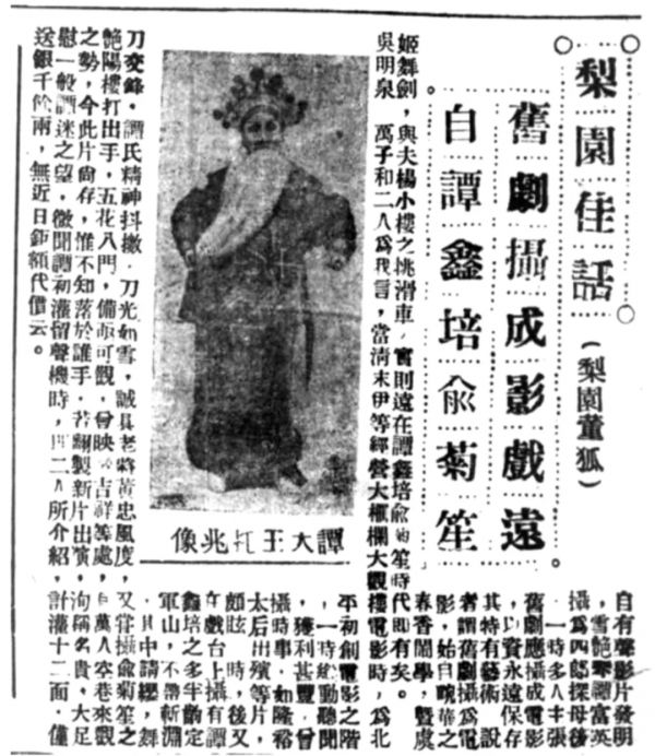 所知最早直接提到《定军山》电影的史料是1935年北京《益世报》上一篇作者署名“梨园董狐”的文章《梨园佳话 旧剧摄成影戏远自谭鑫培俞菊笙》简称“梨园董狐版”。(见下图)