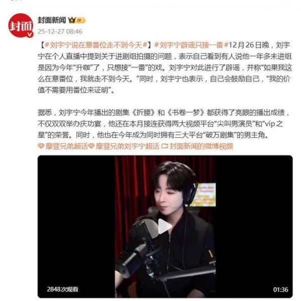 一句“我的价值不需要番位来证明”,让刘宇宁在12月26日晚的直播里直接“杀”上了热搜。面对“升咖后只想接一番、导致一年多没进组”的坊间传闻,这位新晋“平台宠儿”的回应,可谓干脆利落,直接撕开了娱乐圈“番位争夺战”的遮羞布。