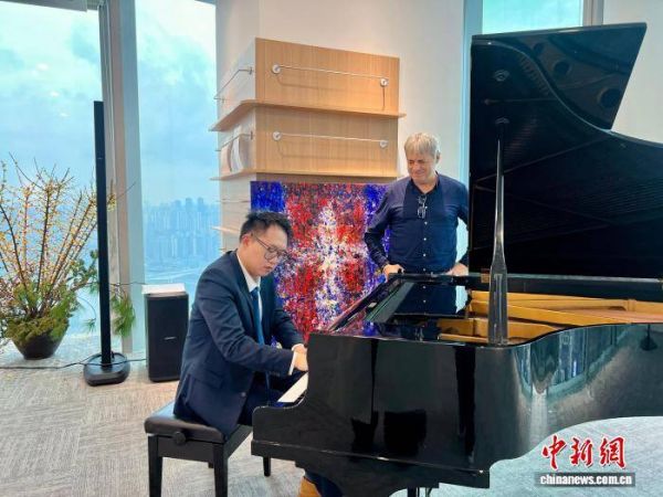 2025年12月,匈牙利艺术家阿提拉·珂纽(右)与中国音乐创作人张瀚心为视听音乐会排练。中新社记者 钟旖 摄