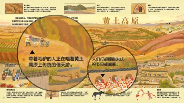 书中既有大山大河,也有许多烟火气十足的生活气息。以“黄土高原”这一页为例,能看到黄土地上牵着毛驴的人正在唱着“信天游”,能看到窑洞窗户上贴着红灿灿的剪纸窗花,还能看到喜气洋洋舞着红绸带的腰鼓队……每一页都是如此,大场景与小细节有机结合、生机盎然。