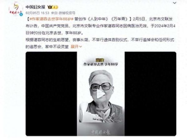 梁左、梁天母亲,《人到中年》作者谌容因病离世