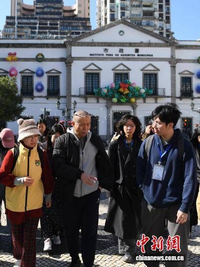 1月8日,毕飞宇(左二)在澳门议事亭前地广场与入选“澳门故事——青年作家在地创作培育计划”的学员们交流。中新社记者 郑嘉伟 摄