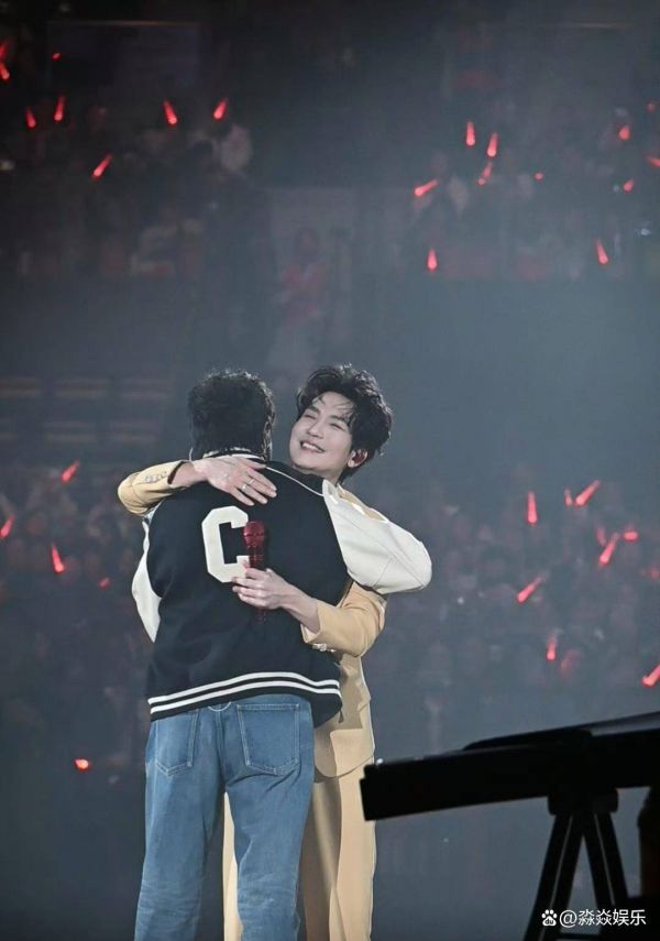 如果说与古巨基的重唱是“精致的较真”,那陈楚生与吴镇宇在天津演唱会上的《友情岁月》则是“野性的默契”。这场合作的第一遍堪称“兵荒马乱”,吴镇宇抢拍后,陈楚生与乐队在后面疯狂追赶节奏,最终却以两人抱在一起笑成一团收尾。没有尴尬的补救,只有性情流露的开怀,台下观众乐不可支,直言“这段相声值回票价”。更妙的是两人的互动脱口秀:吴镇宇调侃陈楚生“找的嘉宾都不如他,自己就是个托”,还打趣他要去参加《无限超越班》当演员,陈楚生则顺势追问“大哥,不讲关系,你觉得我可以吗”,一来一往间满是江湖气与烟火味。