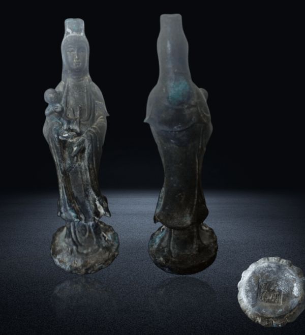 这尊大明宣德款铜铸送子观音立像,以风磨铜为骨,以失蜡法为工,以观音法相为魂,更以空心藏舍利为宗教内核,将明代宣德朝的铸造工艺、佛造像美学与佛教文化熔铸于一体。它不是一件普通的铜铸造像,而是明代宗教艺术的“传世瑰宝”——精工的铸造里藏着宣德造像的工艺密码,慈柔的法相中凝着民间信仰的美好祈愿,空心藏舍利的设计则刻着佛教文化的神圣内涵。