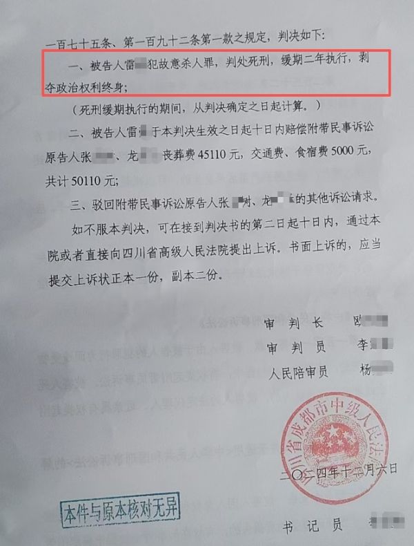 经一审判决,被告人雷某犯故意杀人罪,判处死刑,缓期二年执行,剥夺政治权利终身;被告人雷于本判决生效之日起十日内赔偿附带民事诉讼原告人丧葬费45110元,交通费、食宿费5000元,共计50110元;二审维持原判。