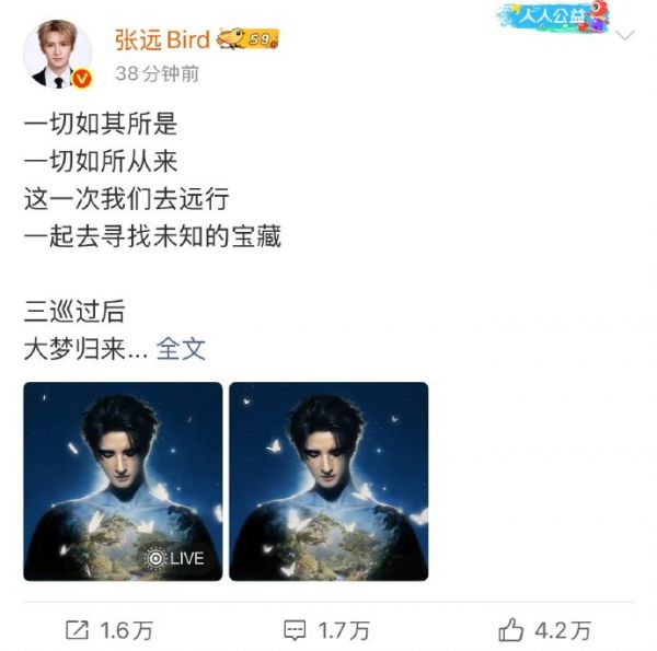#张远远行巡回演唱会# @张远Bird 四巡“远行”官宣,张远确实很行!全新概念全新主题,歌单也一定更佳丰富精彩,期待更多宝藏歌曲上桌!