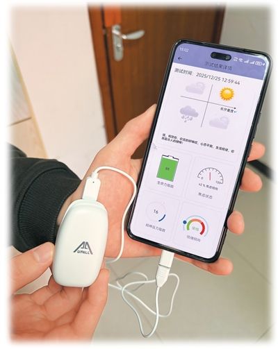 俞俊生向记者展示了其团队设计的便携式AI心理测评设备是如何使用的。工作人员将一个小巧的白色设备夹在被测试者的手指上,设备的另一端连接到手机。几分钟后,手机屏幕上就显示出了被测试者的各项指标,包括身心平衡状态、生命力指数、焦虑状态、精神压力指数、情绪倾向等。