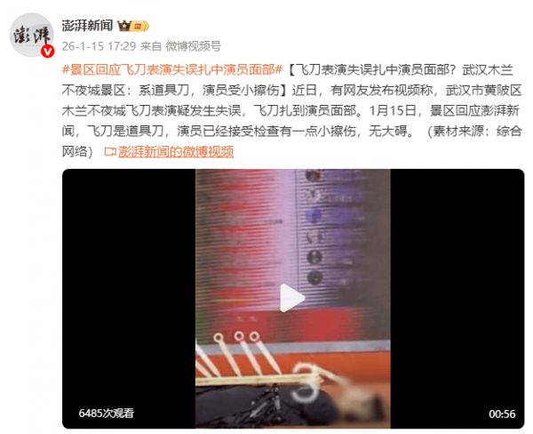 近日,有网友发布视频表示,武汉市黄陂区木兰不夜城在一场飞刀表演中疑似发生失误,飞刀扎到了演员的面部。1月15日,景区回应:飞刀是道具刀,演员已经接受检查有一点小擦伤,无大碍。