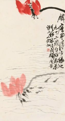 齐白石生前曾说,自己最得意的学生是李苦禅和许麟庐,对两人偏爱有加,每有妙手之作,时常转赠爱徒。齐白石晚年曾在珍藏多年的乾隆纸上画了两幅题材相似的精品荷花,一幅为带倒影的荷花,一幅是花瓣下一群蝌蚪顶瓣而游,他有意将这两幅画分赠给两人,分别题跋“苦禅弟得此,缘也”“麟庐弟得此,缘也”,并注释“九十二岁白石画。若是何缘故,问麟庐、苦禅二人便知”。李苦禅和许麟庐惊喜之余却难以抉择,最后通过抓阄,李苦禅得了《红荷蝌蚪》,《荷花倒影》归许麟庐所有。后来,齐白石还曾为他们各画过一张《不倒翁》,画上题诗:“乌纱白扇俨然官,不倒原来泥半团。忽然将汝来打破,通身何处有心肝。”