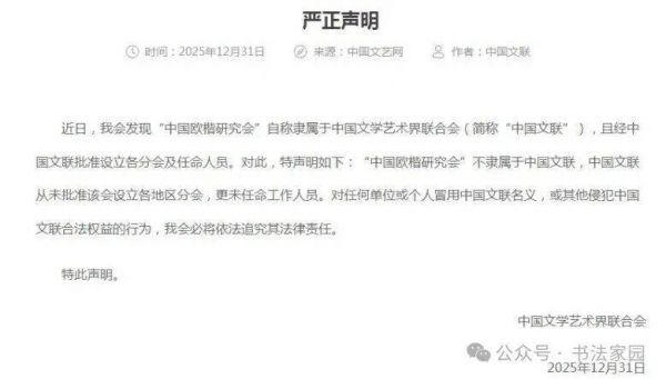 中国文学艺术界联合会近日发布严正声明,澄清“中国欧楷研究会”不隶属于中国文联,且中国文联从未批准该组织设立各地区分会或任命任何工作人员。声明强调,任何单位或个人冒用中国文联名义的行为均属违法,中国文联将依法追究相关法律责任。以下是声明原文: