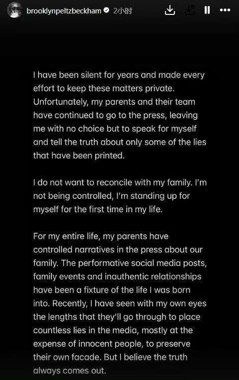 1月20日,贝克汉姆长子布鲁克林在社交平台发长文控诉父母,称其操控媒体叙事、破坏他与妻子的婚姻并强迫签署姓氏协议。此外还包括母亲维多利亚临时取消为儿媳设计的婚纱,当众抢走新人首支舞并作出“不得体举止”等行为。此前,因婆媳关系不佳,布鲁克林·贝克汉姆与家人关系破裂传闻已久。