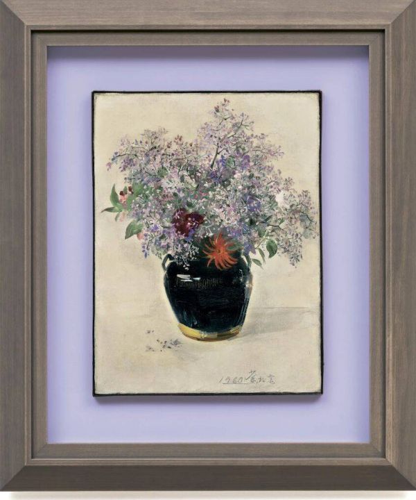 作品没有复杂的背景,只有几瓣落花与极淡的影,这“留白”恰是东方美学最自信的表达,不解释,不填满,画中紫色丁香如烟霞朦胧,桌面隐去,只留几片落花与浅影,满满东方留白的韵味。花瓶平涂宁静,花枝松散恣意——吴冠中笔下的中西融合,温柔又坚定。让你听见花开的声音,闻到时光拂过的气息。