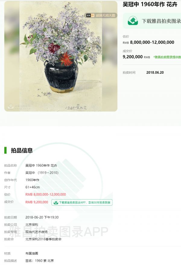 七年时间艺术价值没怎么跌,摩擦了佣金成本,印象里似乎有过千万的作品,查了下,最高价就是这件花卉和老虎同价,老虎拍过多次,没有这件花卉吸引人…看来上千万现在是个大门槛~