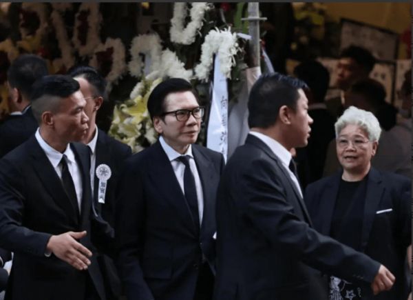 白色花海簇拥的殡仪馆前,吊唁的队伍缓缓挪动,这场葬礼的规格,从一开始就注定不凡。向家至亲的身影,在人群中格外醒目。向佐一身笔挺黑西装,身形挺拔却难掩眉宇间的落寞,眉头紧锁表情肃穆,陪伴在母亲向太身侧,消瘦的脸庞更添几分沉稳。向太陈岚同样一袭素黑装扮,头发梳得一丝不乱,腰背挺得笔直,双手交握于身前,每一步都走得沉稳,可微微僵硬的身形,却将心底的哀恸暴露无遗。向华强则在众人簇拥下现身,黑框眼镜遮不住自带的大佬气场,步履间尽是历经风雨的从容。现场还有一队身着白色校服的小辈,按照潮汕丧葬习俗,为这位长辈送别,稚嫩的身影在肃穆氛围里,更添几分世事无常的感慨。