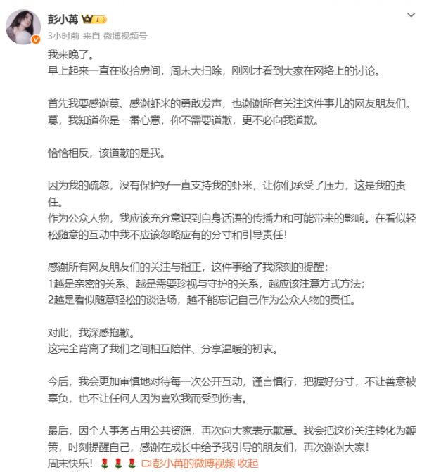 3. 彭小苒发视频向粉丝道歉:会谨言慎行,不让善意被辜负