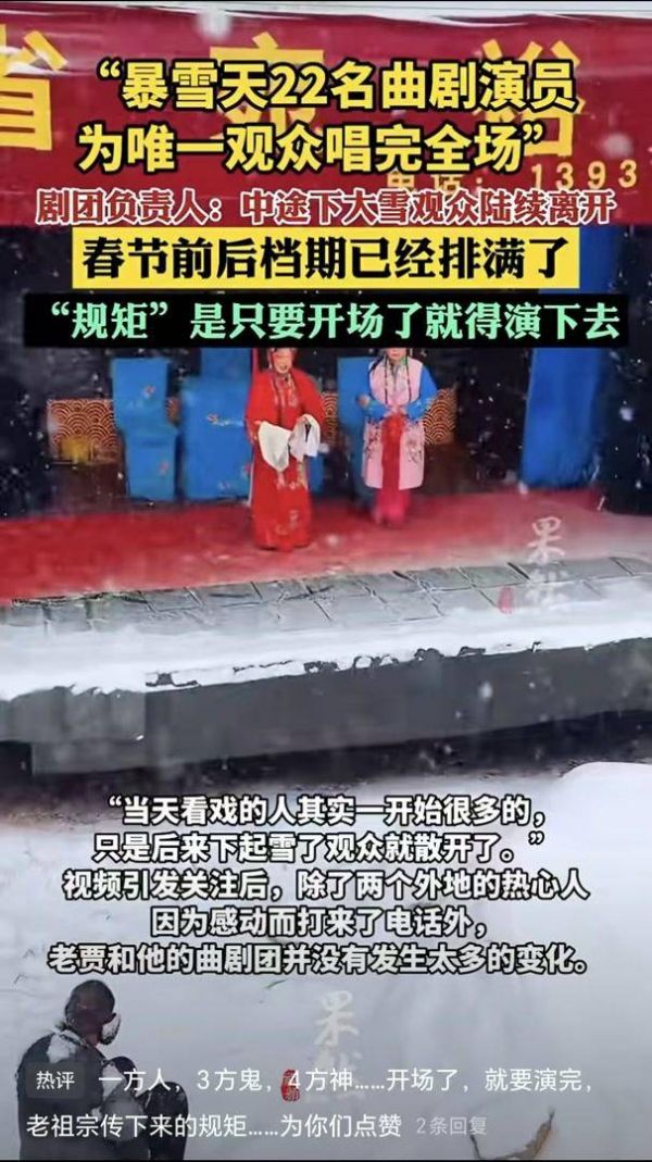 近日,一段“暴雪天22名曲剧演员为唯一观众唱完全场”的视频引发关注。视频中,戏台上曲剧演员挥舞衣袖,戏台下一名老人身上落满了雪,却仍在认真看戏。戏团负责人说,“只要有人喜欢,我们就会一直演下去。”表演曲剧不只是为了混口饭吃,坚守舞台也不是戏没唱完,而是出于对艺术的敬畏和对观众的尊重。观众在暴雪天选择留下,可见对传统戏曲的热爱;剧团全力以赴完成表演,既是出于对曲剧的热爱,更是对观众这份热爱的回应。观众与演员在暴雪中联袂上演的这场大戏,情真意满,煞是好看。