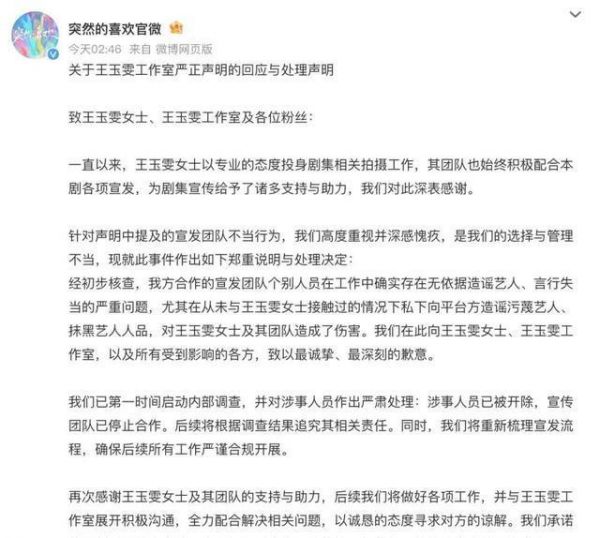 据官方声明所述,突然的喜欢》剧组合作的宣传团队在工作中出现了问题,剧组已经承认了这个问题,并表示合作的宣传团队存在管理上的疏漏,因此剧组对因此造成的负面影响感到非常抱歉,初步的调查结果表明,宣传团队的部分工作人员在没有见过王玉雯本人的情况下,私自将一些不利于王玉雯的不实信息传播到剧集的合作平台,这些造谣生事的行为毫无根据,也给王玉雯本人造成了伤害,诽谤她的形象和品格,面对这种情况,剧组的态度非常明确,公开向王玉雯本人以及合作团队表示了深深的歉意,同时也对王玉雯本人以及所有受到影响的人表示了诚挚的慰问。