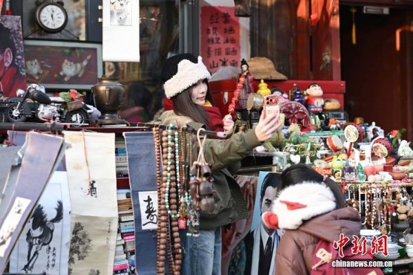 1月27日,游客在杨梅竹斜街一处商铺打卡拍照。春节临近,北京街头节日气氛渐浓。中新社记者 田雨昊 摄