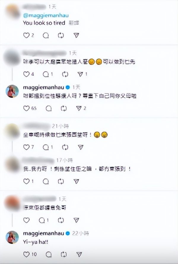 就在大家都在心疼女神太累的时候,一个极其猥琐的留言出现了。有个“口痕友”(嘴欠的人)竟然趁机性骚扰,留言说道:“咪李(你)可以大庭广众地揸人么,可以做到乜先(那你是可以在大庭广众下抓人家么,能做什么呢)?”