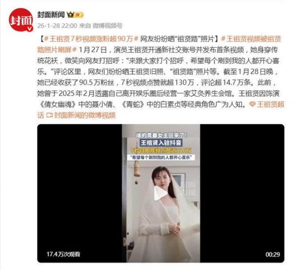 1月27日,一条仅有7秒的视频在网络上炸开了锅。视频里,58岁的王祖贤身穿传统花袄,素面朝天,对着镜头微微一笑,轻声问候:“希望每个刷到我的人都开心喜乐。”没有台词,没有滤镜,更没有精心设计的桥段。就是这样一个简单到极致的招呼,在发布两天后,竟让她新开的社交账号粉丝数狂飙超过90万,视频点赞突破130万,评论近15万条。