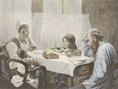 如果仅看名字,很难想象到这幅画作的主题如此沉重。一家四口围坐在餐桌边,背景是简陋的白色窗帘。桌上仅有一个汤盆和一块不新鲜的面包,这就是他们的一顿饭。父亲忧郁地扶着前额,低头看着空空如也的盘子,显得比实际年龄更为苍老;母亲惆怅地望着餐桌,仿佛欲言又止,面前的餐盘倒扣在桌上,体现出她宁可自己吃不饱,也要将所剩无几的食物留给丈夫和孩子们。坐在他们中间的小女孩神态天真,手里握着勺子,充满期待地看向母亲,桌布下隐约可见膝盖破损的裤子。在小女孩对面的椅子里,坐着一个吮吸着小手的婴儿。通过诸多细节,观画者不难发现这个家庭面临的困境。位于画面中心位置的面包,成为他们对食物渴望的直观象征。