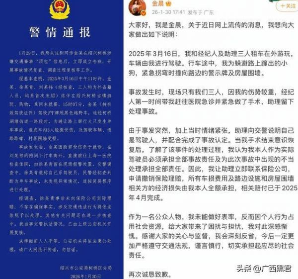 警方通报金晨被曝肇事逃逸,金晨发文致歉:为躲避蹿出小狗撞墙,伤势较重先行就医手术