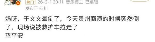 2月1日晚间,歌手于文文无预警冲上热搜,有网友爆料于文文在贵州开演唱会时突然在舞台上晕倒,从而引发外界热议,不少网友为她担忧不已,希望于文文平安无事。