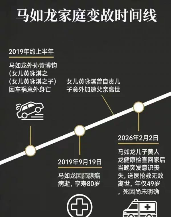 如果站在马如龙四女儿黄泳淇的角度来看,7年前22岁大儿子黄博钧车祸身亡,不时隔不到一个月父亲就撒手人寰,7年后自己的弟弟黄人龙又在家中去世。