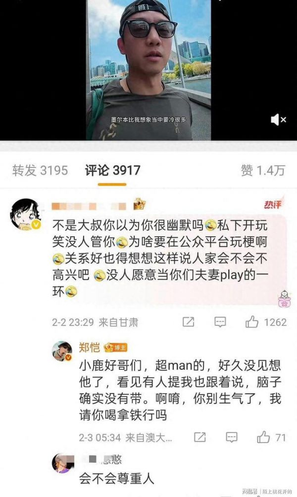 明星的一个举动,究竟能引发多大的波澜?近日,郑恺就因一个玩笑,让自己陷入了舆论漩涡。2026年2月2日,郑恺发布澳网vlog,本是分享生活趣事,却因一条评论回复引发争议。当有网友询问视频结尾的女性是谁时,郑恺竟回复“鹿晗”。这看似随意的玩笑,却瞬间点燃了鹿晗粉丝的怒火。