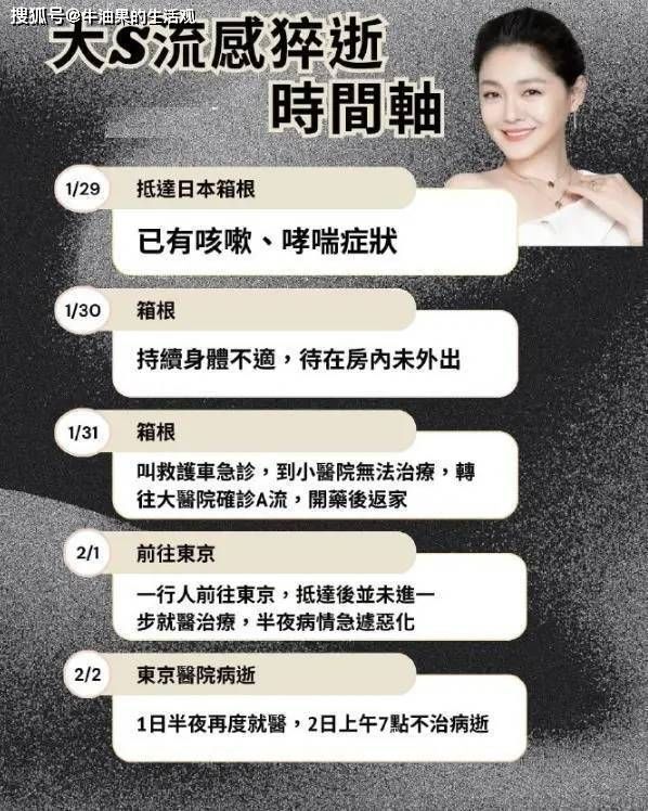 在韩媒播出的节目中,公开了大S从日本旅游开始到离世的时间轴。时间回到2025年1月29日,大S和家人去日本旅行,到了日本后不久就出现高烧和全身酸痛的症状。