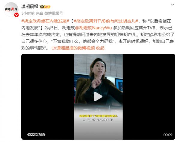 2月5日,胡定欣参加活动回应离开TVB的相关问题,表示已在去年年底完成约定,也有问过来内地发展的姐妹胡杏儿。胡定欣称老公给予自己很多的底气,“不管我做什么,他都会全力挺我”,离开的时机很好,能做自己喜欢的事“唱歌”。