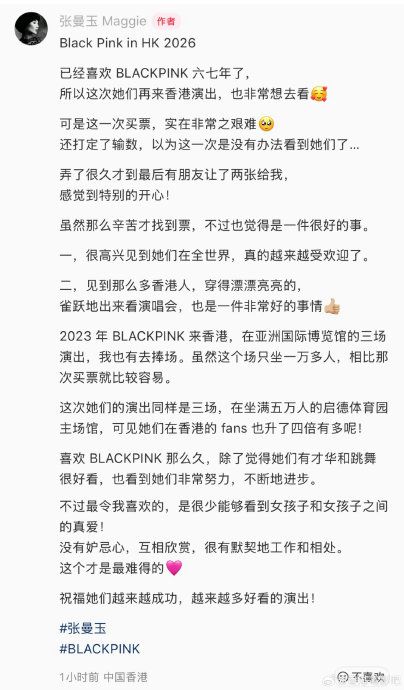 曼玉:“已经喜欢BLACKPINK六七年了,可是这次买票非常之艰难”